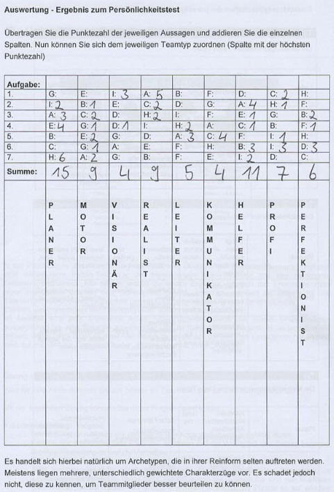 Im Rahmen der Soft-Skill Veranstaltung Teammanagement, habe ich den Belbin-Test durchgeführt, um anhand von diesem unterschiedlich gewichtete Charakterzüge in Archetypen zu identifizieren.