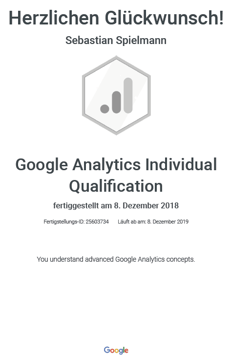 Am 08. Dezember 2018 habe ich erfolgreich die Google Analytics - individuelle Qualifikation - Prüfung abgelegt.