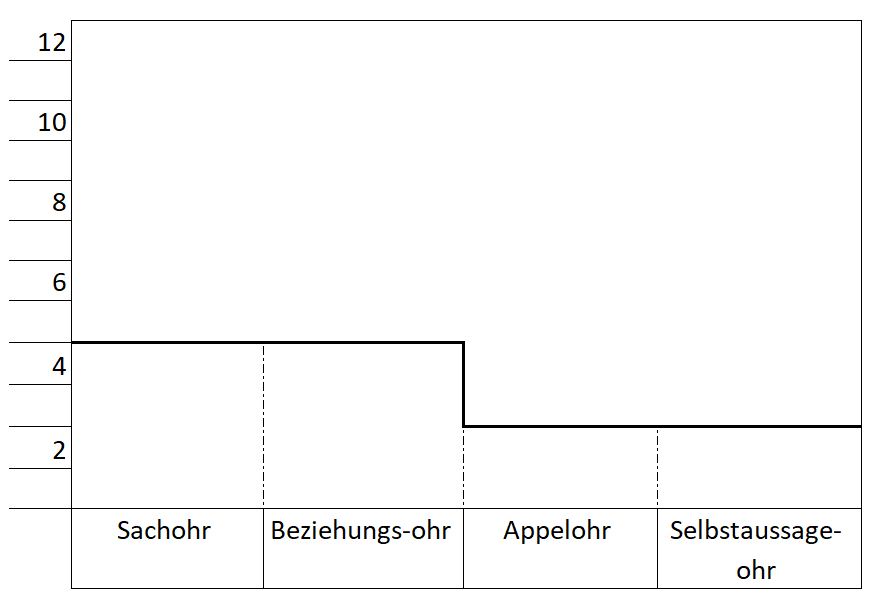 Im Rahmen der Veranstaltung Verhandlungstechnik, haben wir uns mit den verschiedenen Kommunikationsebenen auseinander gesetzt und Probleme dabei identifiziert. Nach dem Kommunikationsmodell (Schulz-von-Thun), kommuniziert jede Person schwerpunktmäßig auf einer anderen Ebene und hat "Ohren", die noch entwickelt werden können. Hierzu haben wir einen Kommunikationstest durchgeführt. Anhand der Grafik sehen Sie die Auswertung meines Tests.