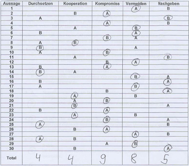 Diese Veranstaltung drehte sich um Verhaltensweisen in Konfliktsituationen und verdeutlichte die Unkosten in Unternehmen, die entstehen wenn kein Konfliktmanagement betrieben wird oder welche Risiken und Auswirkungen sich dahinter verbergen. Um ein Gefühl dafür zu bekommen, wie wir selbst in Konflikten und Diskussionen oder auf Dialoge reagieren, haben wir einen Konfliktsituationstest durchgeführt. Anhand der Grafik erkennen Sie bei mir eine ausgeprägte Kompromissbereitschaft und Konfliktvermeidungshaltung.