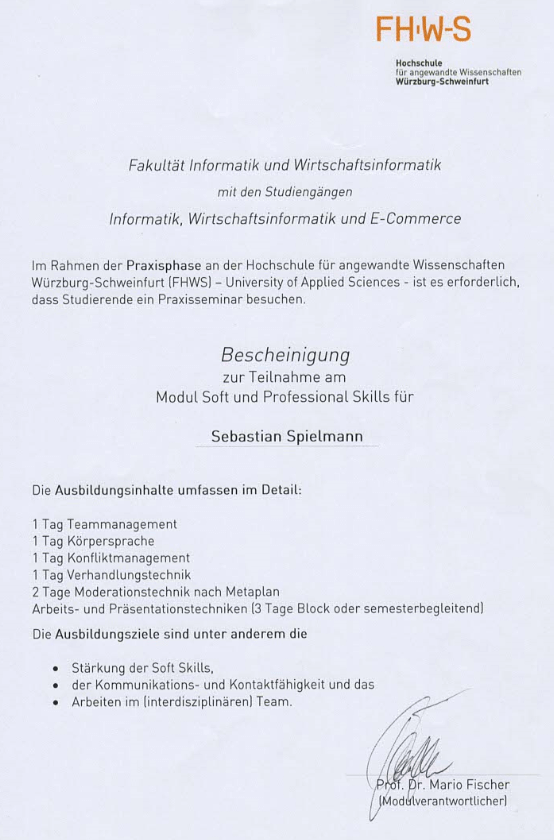 Im Rahmen meines Bachelorhauses habe ich erfolgreich an den Modulen für die Zertifizierung von Soft- & Professional Skills teilgenommen.