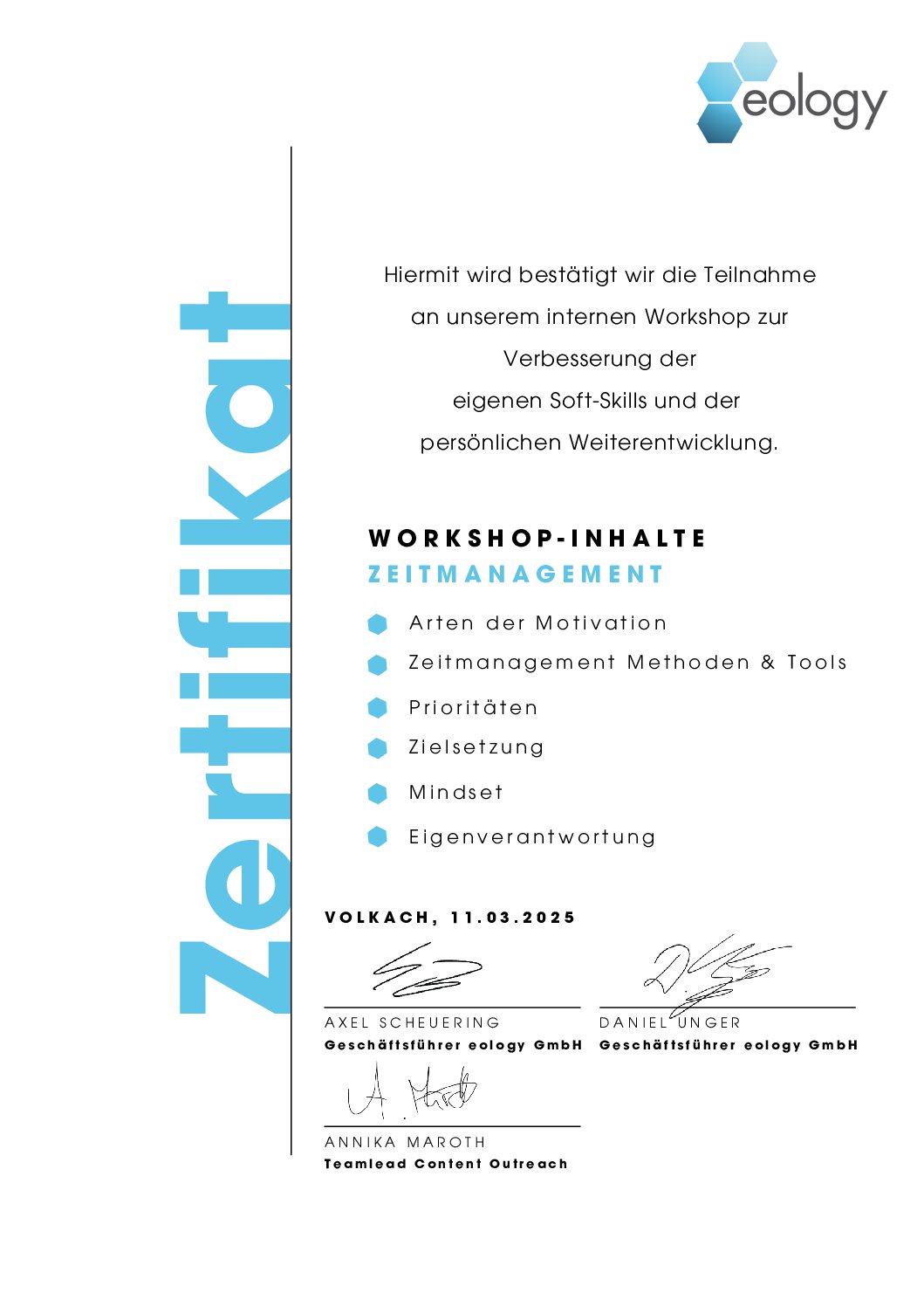 Teilnahme am internen Workshop zu Zeitmanagement mit Zertifizierung.