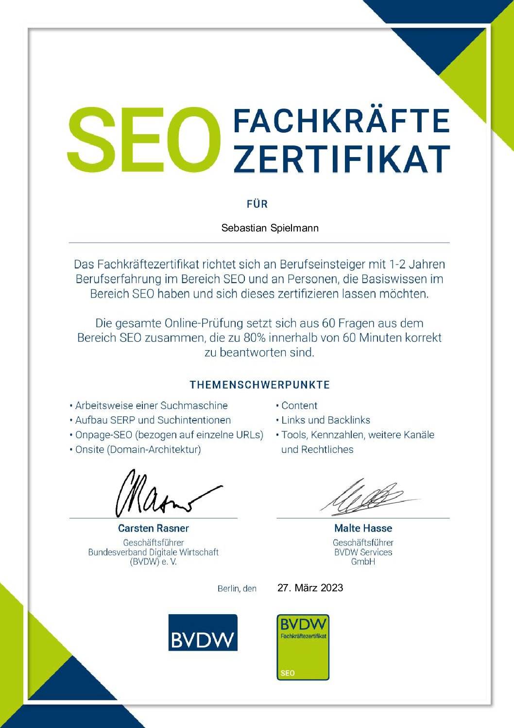 Erfolgreiche Teilnahme an der Prüfung zur SEO Fachkräfte Zertifizierung beim BVDW.