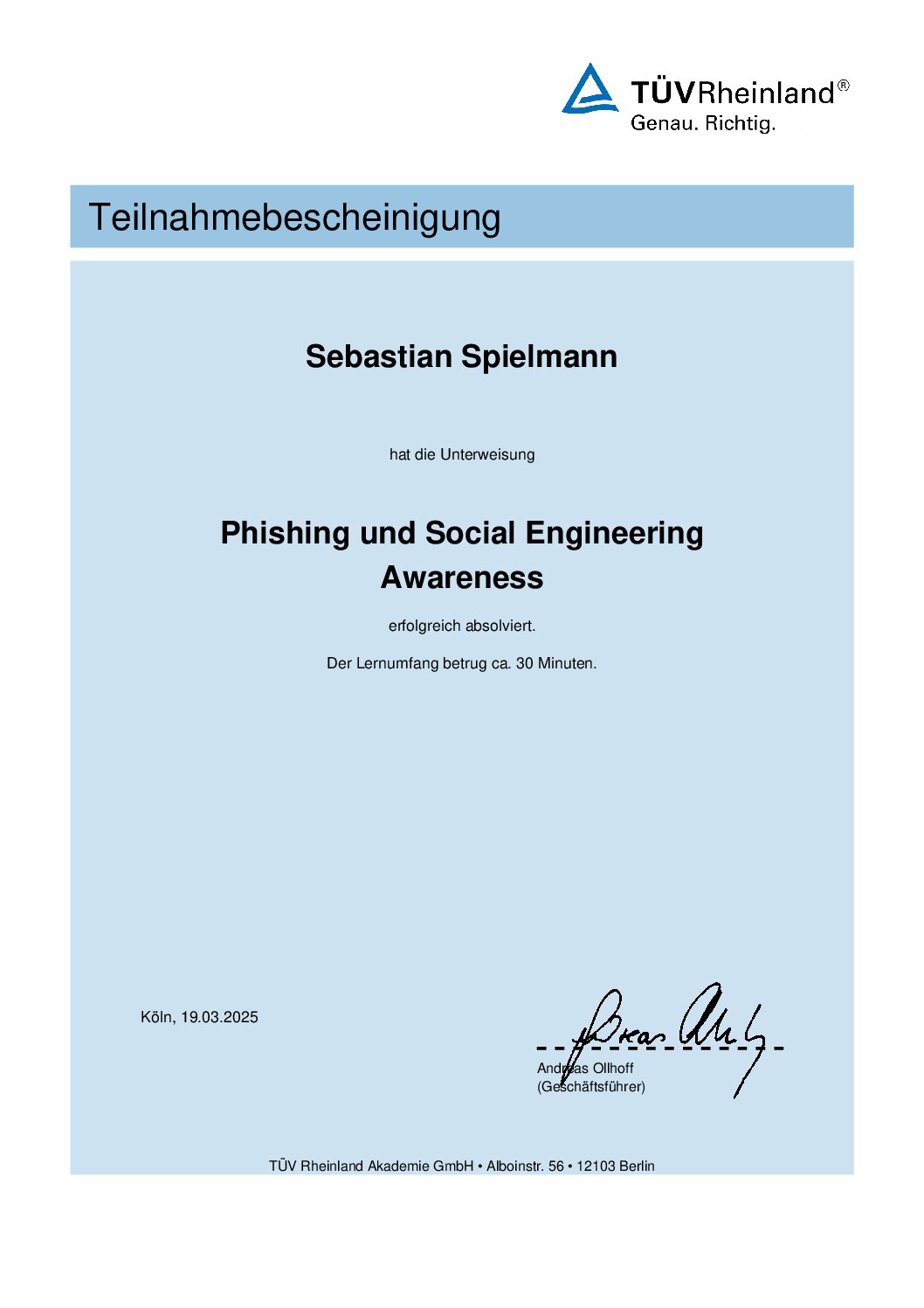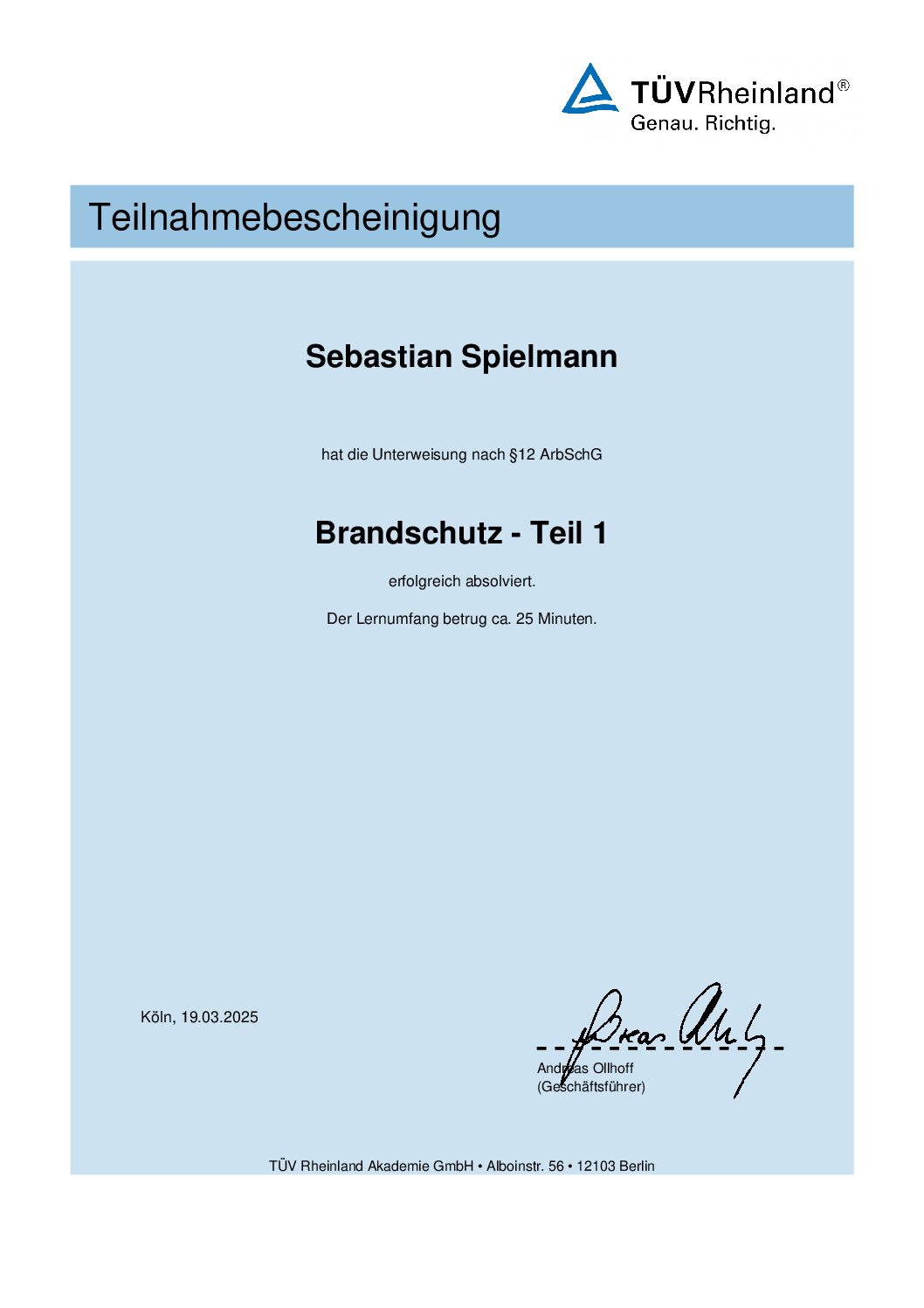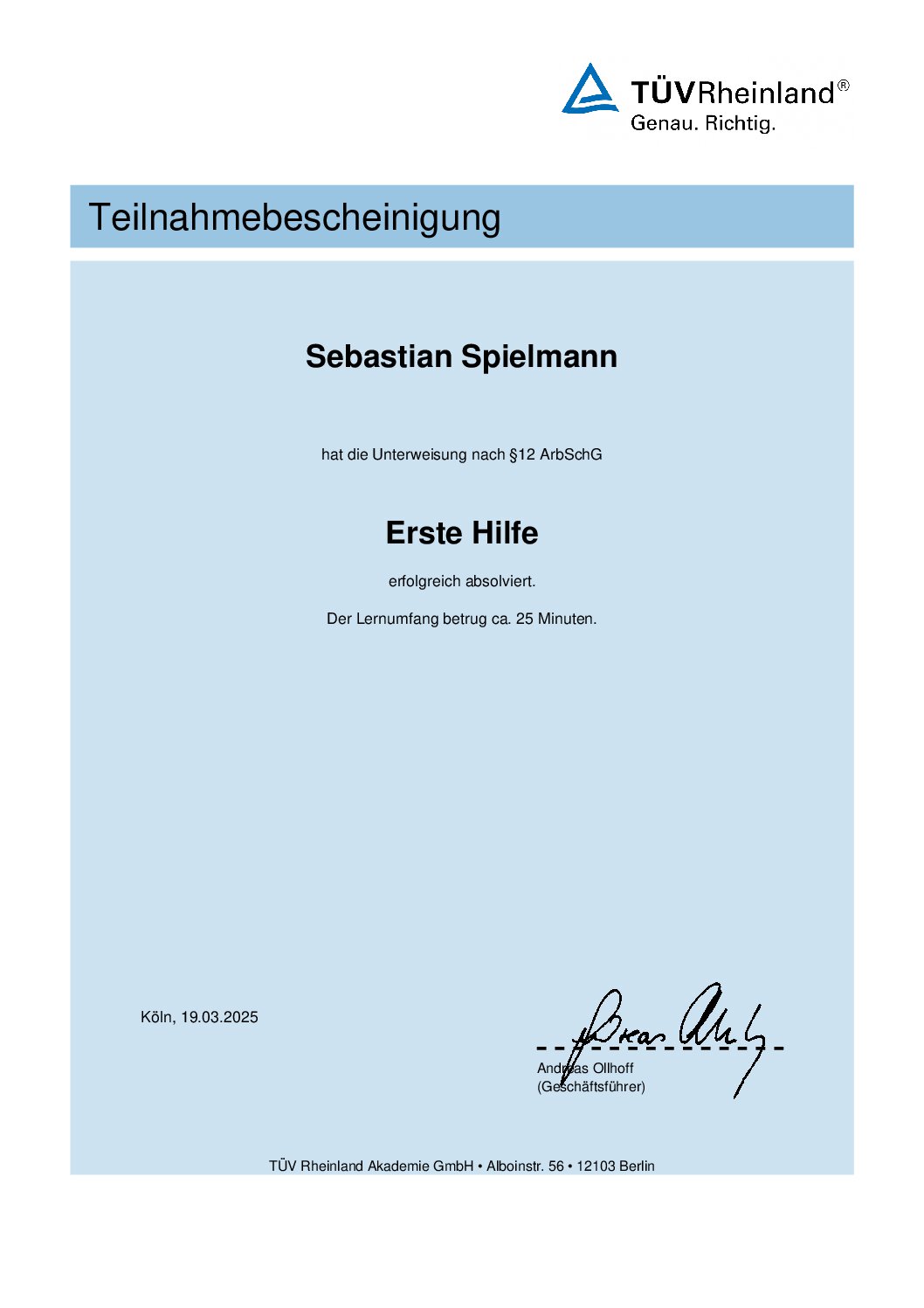 Teilnahme an den Kursen des TÜV Rheinland zu den Themen: