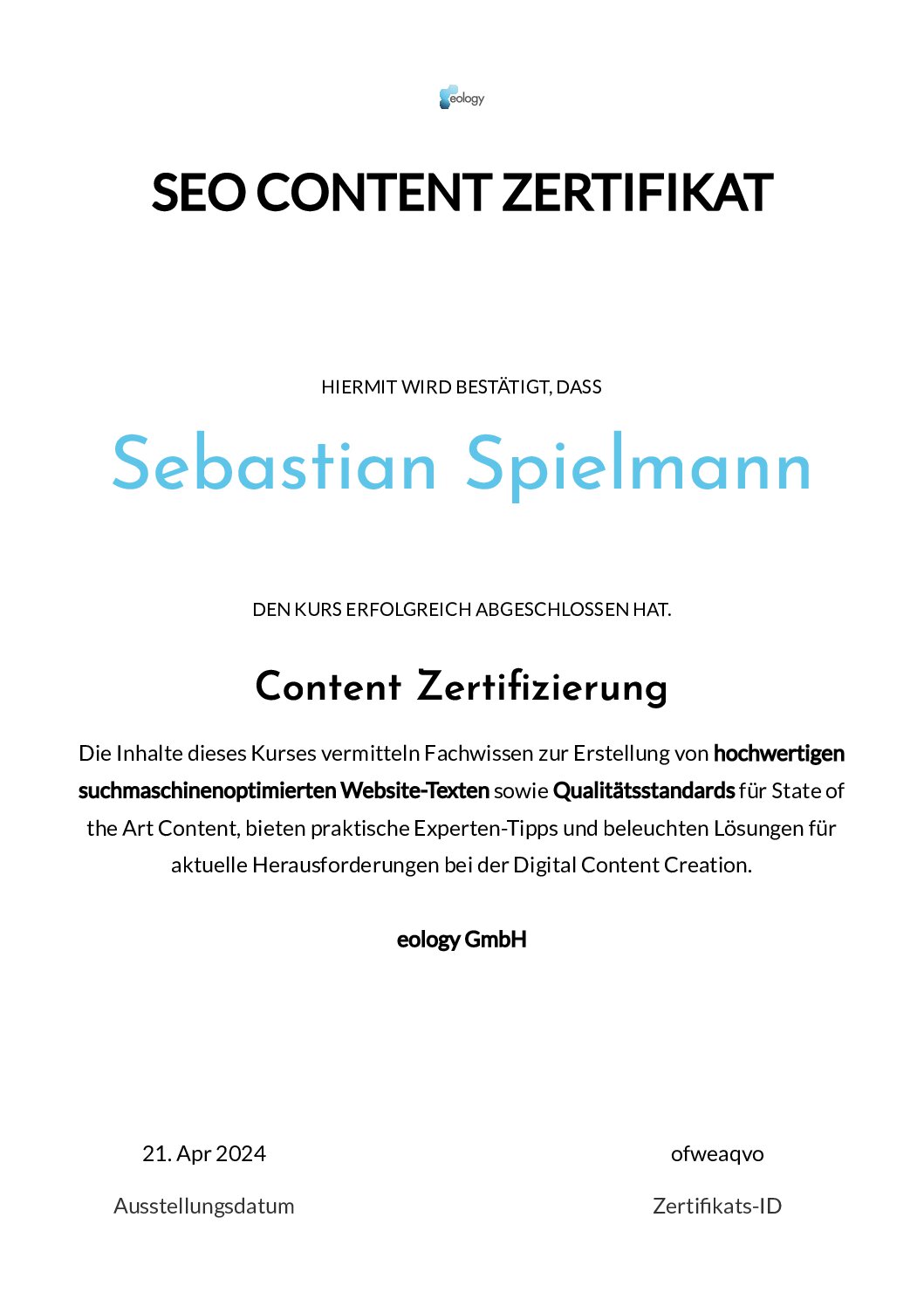 Erfolgreiche Teilnahme am SEO Content Zertifikatslehrgang bei Dr. Bea Eyring.